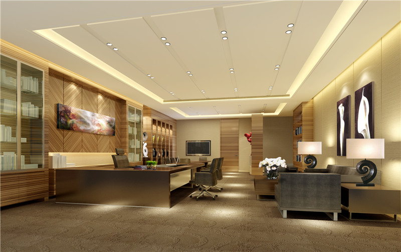 2)辦公室也可以給人的是一種高檔、豪華的感覺。白色的石膏板吊頂搭配黃色的微晶石背景墻顯得非常的和諧,整個辦公室在暖黃色的燈光照耀下顯得非常的奢華,大氣,展現(xiàn)出公司的實(shí)力。