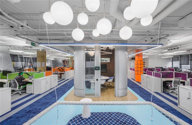 5、高科技公司辦公室裝修裝飾:以時尚美學為主題,借以模塊概念,將傳統(tǒng)辦公與未來科技相結(jié)合,打造一個具有“場景性、互動性、開放性”的辦公空間,不同顏色的地毯,將分割地面并組合作為豎向交通引導,將空間規(guī)劃因勢利導,平面流線順理成章地向前延伸,整體規(guī)劃路線一目了然。在辦公室裝修的時候使用木飾面墻體,既是隔斷,又溫和而有力量。自然方正的形態(tài),讓整個大堂有了延長性、藝術(shù)性,工整有序,流暢而舒適。大面積玻璃代替厚重墻體,輕薄的線條邊框隱匿其中,共享會議室的物理分區(qū)體量被減至小。
